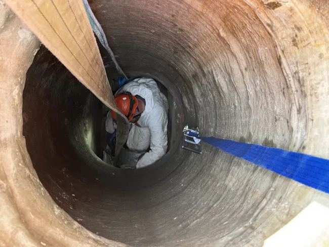 Sanierung eines Eiprofils 60 x 90 cm mittels GFK-Schlauchliner mit UV-Aushärtung, inklusive Harzpressverfahren aufgrund hoher Grundwasserstände.